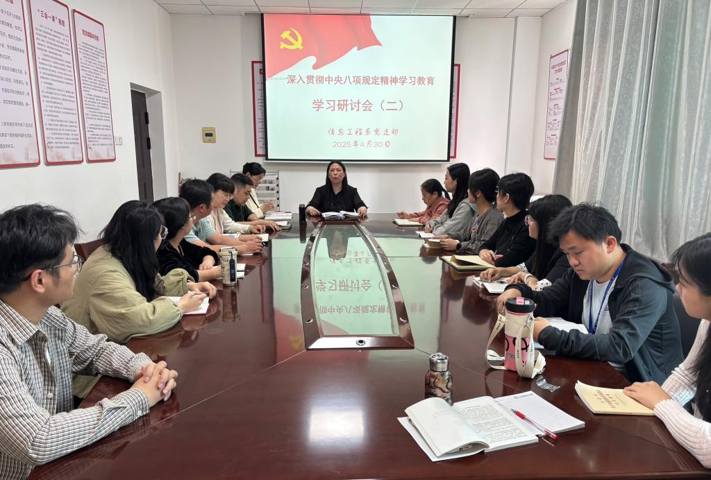 4月30日,信息工程系党支部组织全体党员在党员活动室开展了深入贯彻中央八项规定精神学习教育学习研讨会,会议由党支部书记主持。